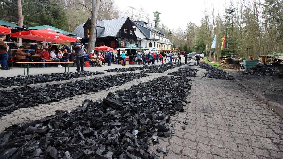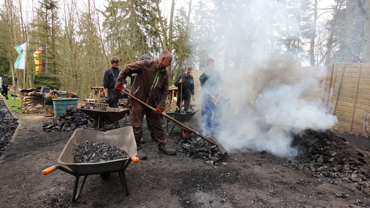 Hunderte Gäste verfolgten das Geschehen bei einem kleinen Fest an der Köhlerhütte. Etwa 180 Säcke mit rund 7 Kilo Holzkohle sind zusammengekommen, sagte Heiko Schmidt. Die handgeköhlerte Kohle kann, solange der Vorrat reicht, an der Köhlerhütte gekauft werden.