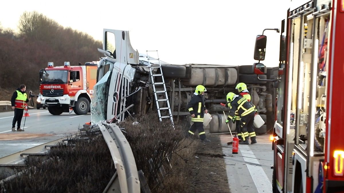 Als der 41 Jahre alte Fahrer deshalb abrupt gegenlenkte, stellte sich sein Fahrzeug quer und kippte um. Die Zugmaschine durchbrach die Mittelleitplanke und geriet auf die Gegenfahrbahn. Verletzt wurde laut Polizei niemand. Aus dem Fahrzeug lief jedoch Diesel aus.