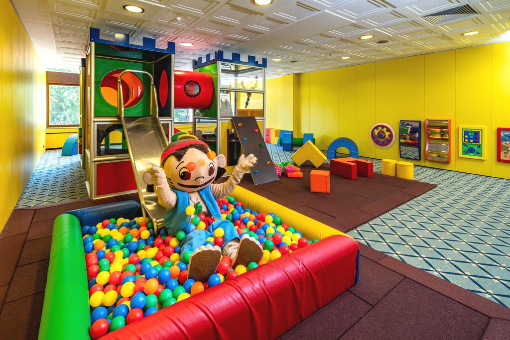 Unter anderem gibt es einen großen Spielturm mit 2 Rutschen und Kletterwand, XL Bausteine, XL Schaumstofffiguren, 2 Verzerrungsspiegel und 7 tolle Wandspiele für die Kleinen.