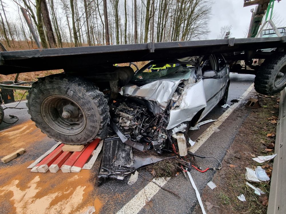 - Das Auto verkeilte sich unter dem zweiten Traktoranhänger und wurde bis zum Stillstand des Gespannes mitzogen.