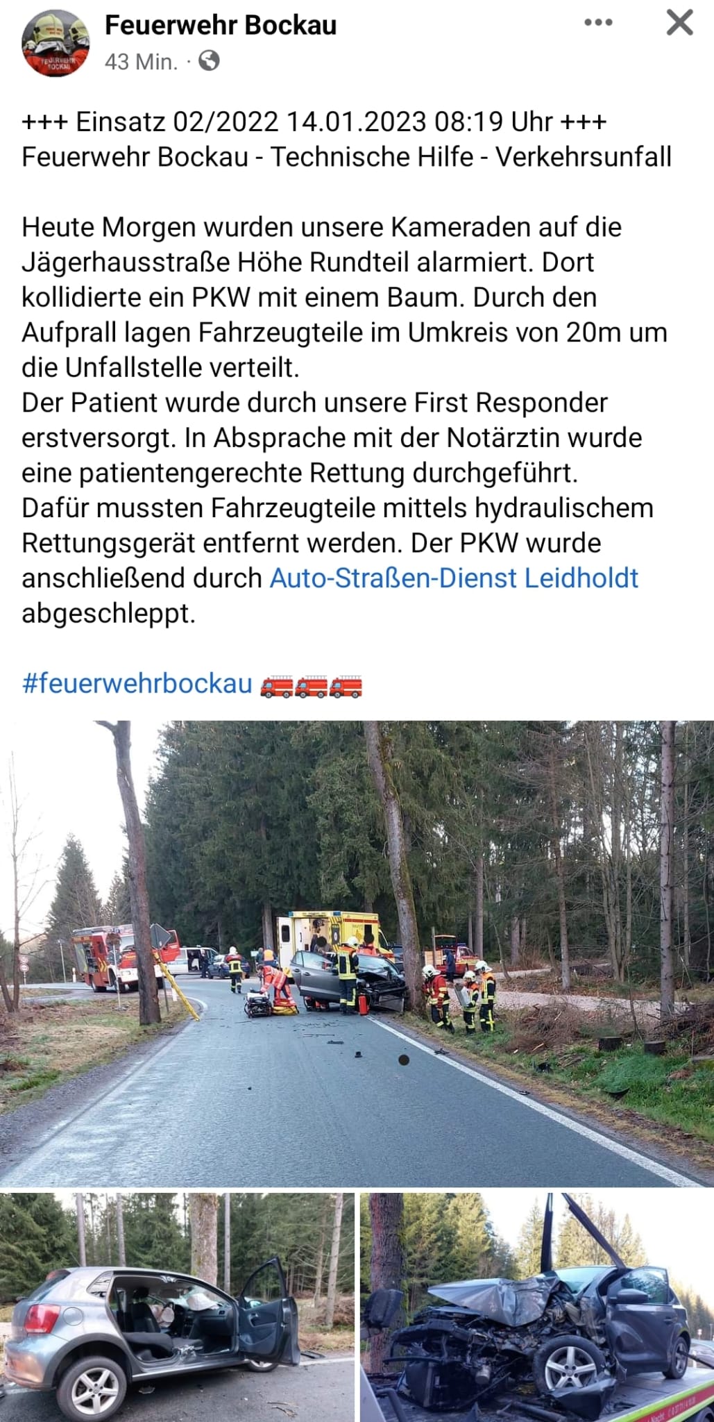 Durch den Aufprall lagen Fahrzeugteile im Umkreis von 20 Metern um die Unfallstelle verteilt. Für die Bergung mussten Fahrzeugteile mit einem hydraulischen Rettungsgerät entfernt werden. Im Einsatz waren die Kameraden der Feuerwehr Bockau.