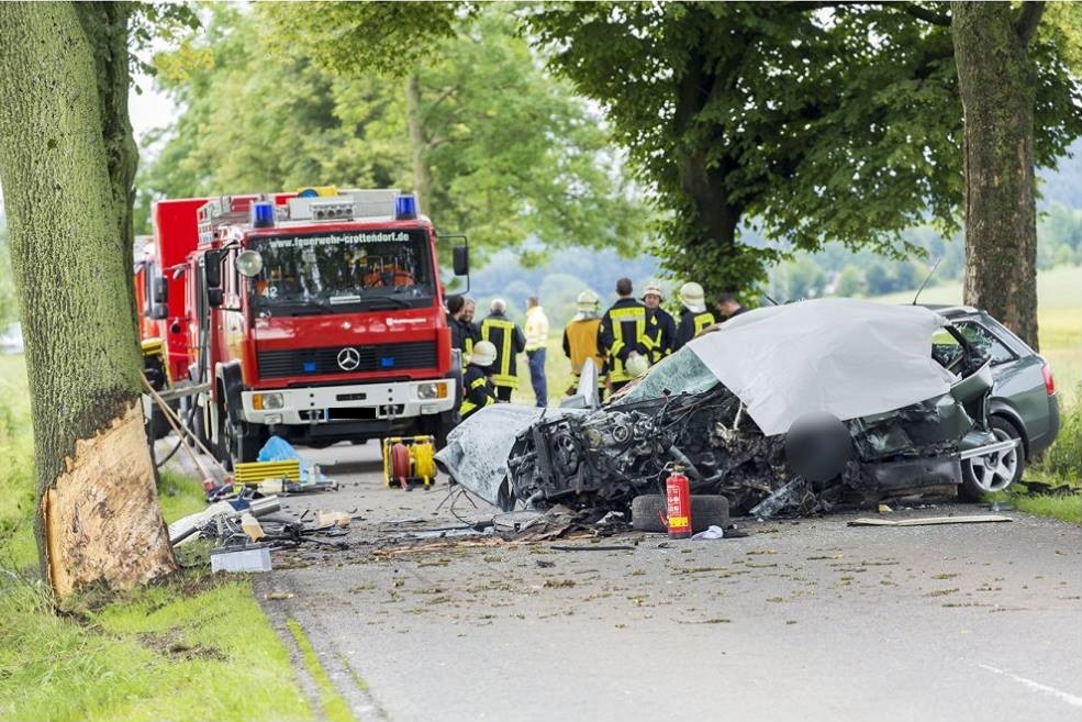 - Ungebremst krachte der Wagen am Mittwoch gegen den Baum - der Fahrer starb noch an der Unfallstelle. (c) Medienservice Erzgebirge