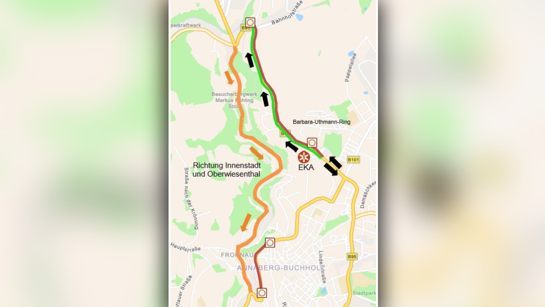 Aus Richtung Chemnitz ist die B 95 ab der Zschopautalkreuzung weiter gesperrt. Stadtauswärts ist frei. Der Abzweig Wiesa ist aus allen Richtungen gesperrt. Eine Umleitung geht über Schönfeld.