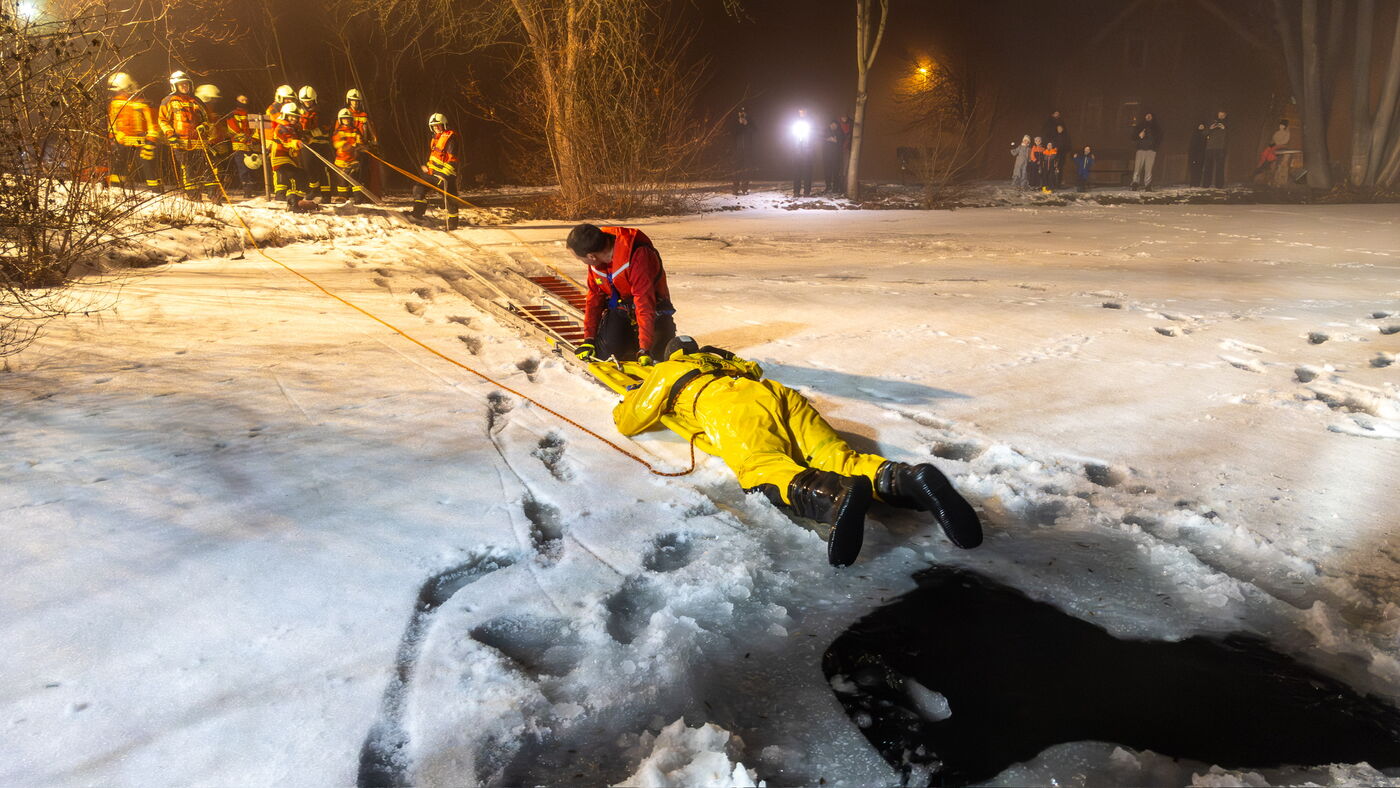 Im theoretischen Teil ging es zunächst um Gefahren und richtige Verhaltensweisen auf Eisflächen. Anschließend übten die Einsatzkräfte auf dem Gewässer selbst. Mit Steckleiterteilen, Spineboard oder Schleifkorbtrage vergrößerten sie die Auflagefläche, um einen Einbruch ins Eis zu vermeiden.