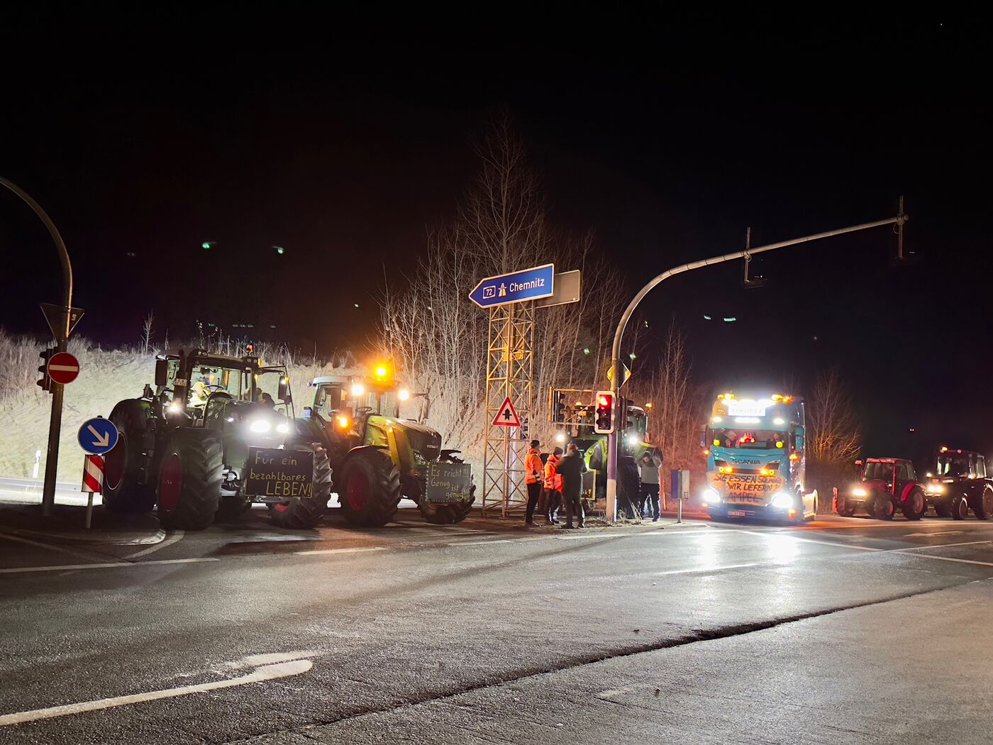 Kurz nach 5 Uhr wurde in Hartmannsdorf bei Chemnitz das Großtanklager durch Bauern und Handwerker blockiert. Kein Tanklastzug kann auf das Gelände. Laut unserem Reporter vor Ort wurde bis zum Eintreffen der ersten Polizeiwagen (kurz vor 7 Uhr) außer dem Rettungsdienst niemand durchgelassen. Auf der A72 staute sich der Verkehr in der Abfahrt. Vom Kreisverkehr Hartmannsdorf bis zur Anschlussstelle A72 drehte sich zeitweise kein Rad. Nach unseren Informationen sollte die Blockade dort bis 17 Uhr bestehen bleiben.