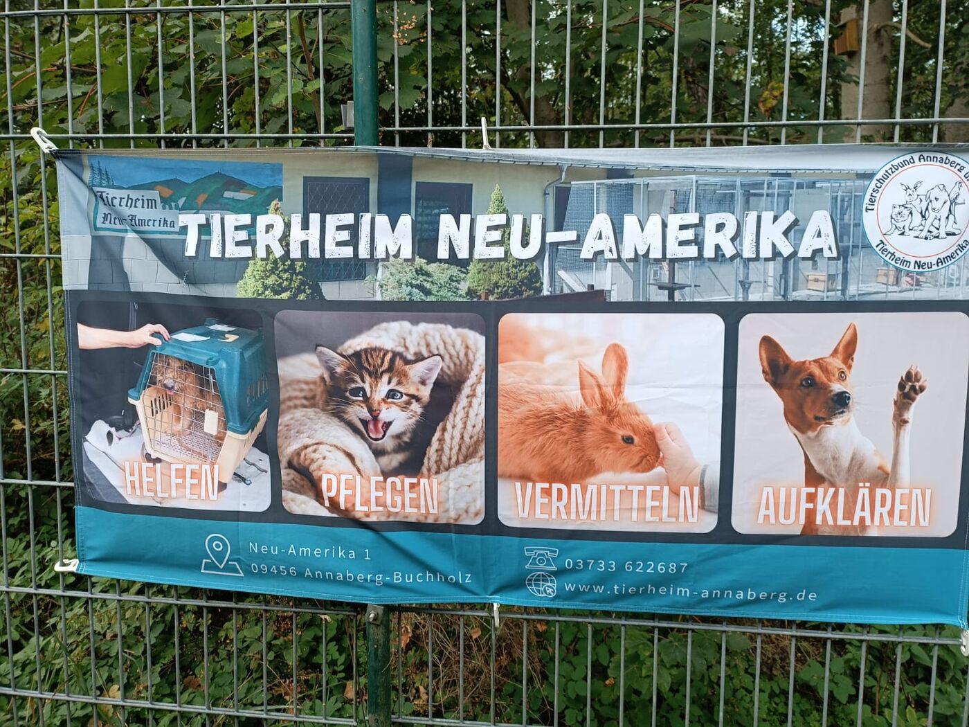 - Das Plakat am Zaun lädt zum Reinkommen ein.