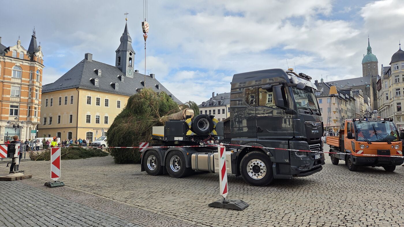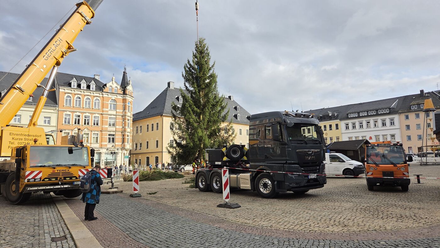 Annaberg hat seinen Weihnachtsbaum. Die rund 22 Meter hohe Fichte wurde am Morgen in Frohnau gefällt und anschließend über die Sehmatalstraße, die B95 und die Große Kirchgasse zum Markt transportiert. Dort wartete schon ein Kran, mit dessen Hilfe der Baum aufgestellt wurde. Alles klappte reibungslos.