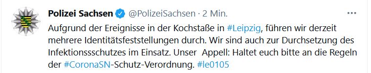 Demnach waren rund 200 Teilnehmer einer vorherigen Kundgebung in Richtung Connewitz gezogen. Mobile Aufzüge seien derzeit aber nicht erlaubt, erklärte Polizeisprecher Olaf Hoppe. Daher habe die Polizei dort Kräfte zusammengezogen. Aus einer Gruppe von 20 bis 30 Menschen seien Pyrotechnik und Gegenstände auf die Polizisten geworfen worden. Daraufhin seien mehrere Verdächtige festgesetzt worden. Die Stimmung sei gereizt gewesen. Im Anschluss wurde eine spontane Demonstration unter dem Motto "Gegen die polizeilichen Maßnahmen" angemeldet und von der Versammlungsbehörde für zwei Stunden auch zugelassen.