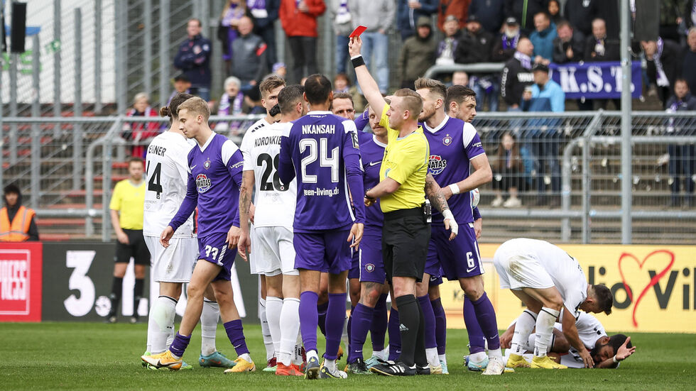 Nach Wiederanpfiff kam auch Aue besser ins Spiel. Aufgrund einer Roten Karte gegen Sam Schreck nach einem Foul gegen Jamil Siebert mussten die Sachsen die Begegnung ab der 62. Minute jedoch zu zehnt bestreiten. Köln nutzte den Vorteil. Erst traf Becker im Nachschuss, dann erhöhte Koronkiewicz, bevor Lankford den Endstand herstellte (dpa).