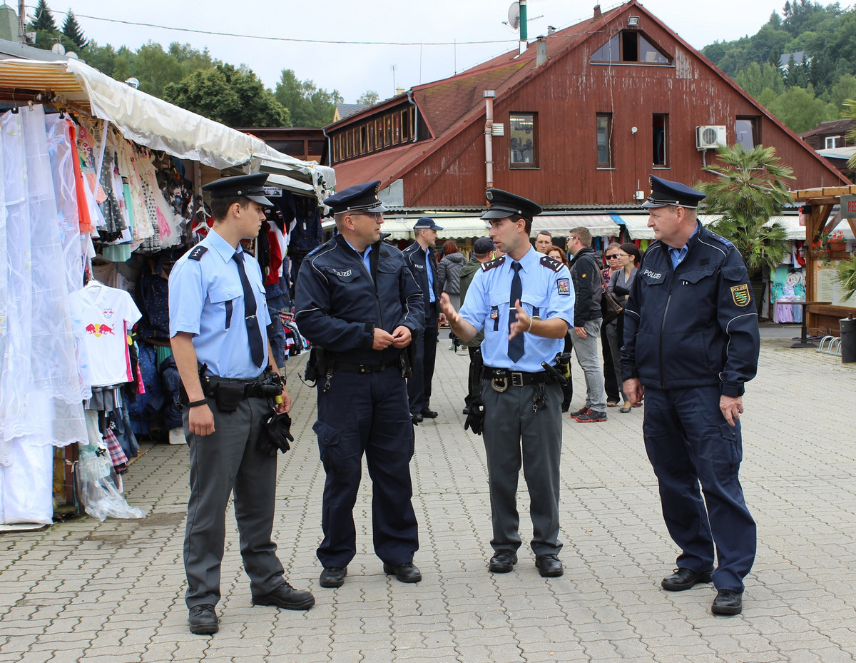 Am Grenzübergang gehen deutsche und tschechische Polizisten regelmäßig gemeinsam auf Streife. Die Beamten waren am Donnerstag zusammen auf dem Asiamarkt in Tschechien und bei einer Verkehrskontrollen im Einsatz. Die Zusammenarbeit dient hauptsächlich dem Erfahrungsaustausch und der Prävention. So beantworten die deutschen Beamten häufig Fragen von Touristen welche Mengen Zigaretten und Alkohol über die Grenze mitgenommen werden dürfen und welche Waffen in Deutschland generell verboten sind. Möglich machte die gemeinsamen Einsätze eine Änderung der Polizeiverordnung vor einem knappen Jahr.