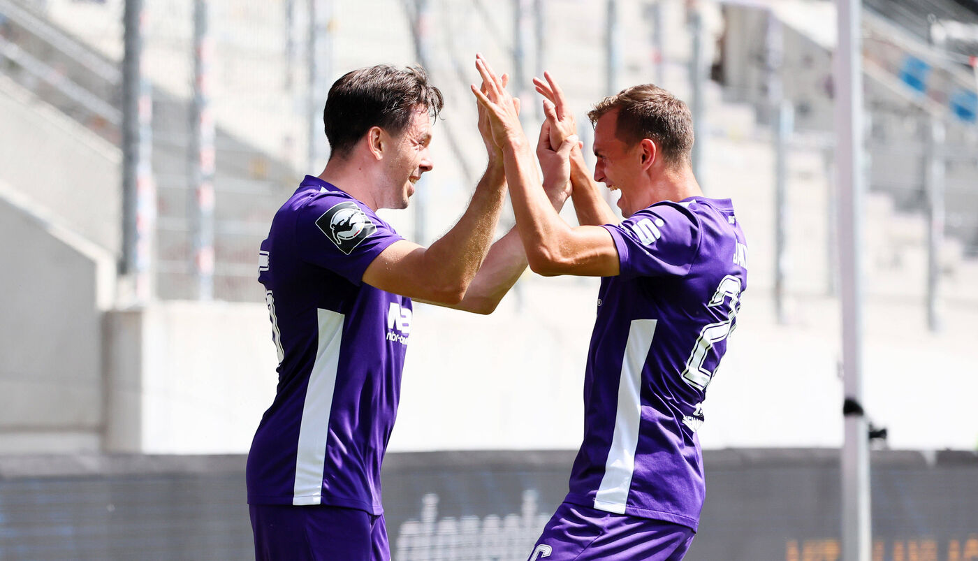 - Marcel Bär und Kilian Jakob bejubeln das 2:1 des FC Erzgebirge