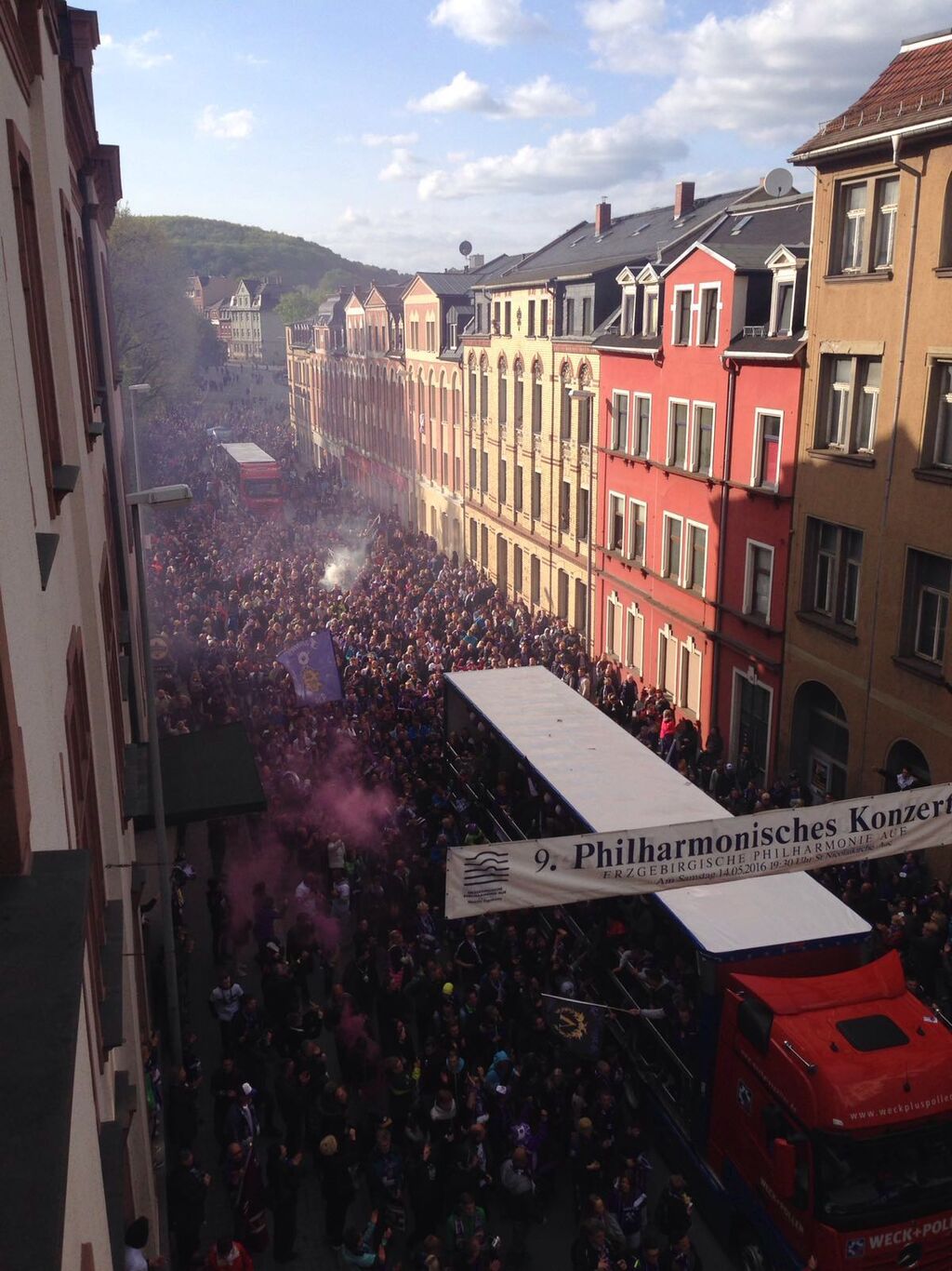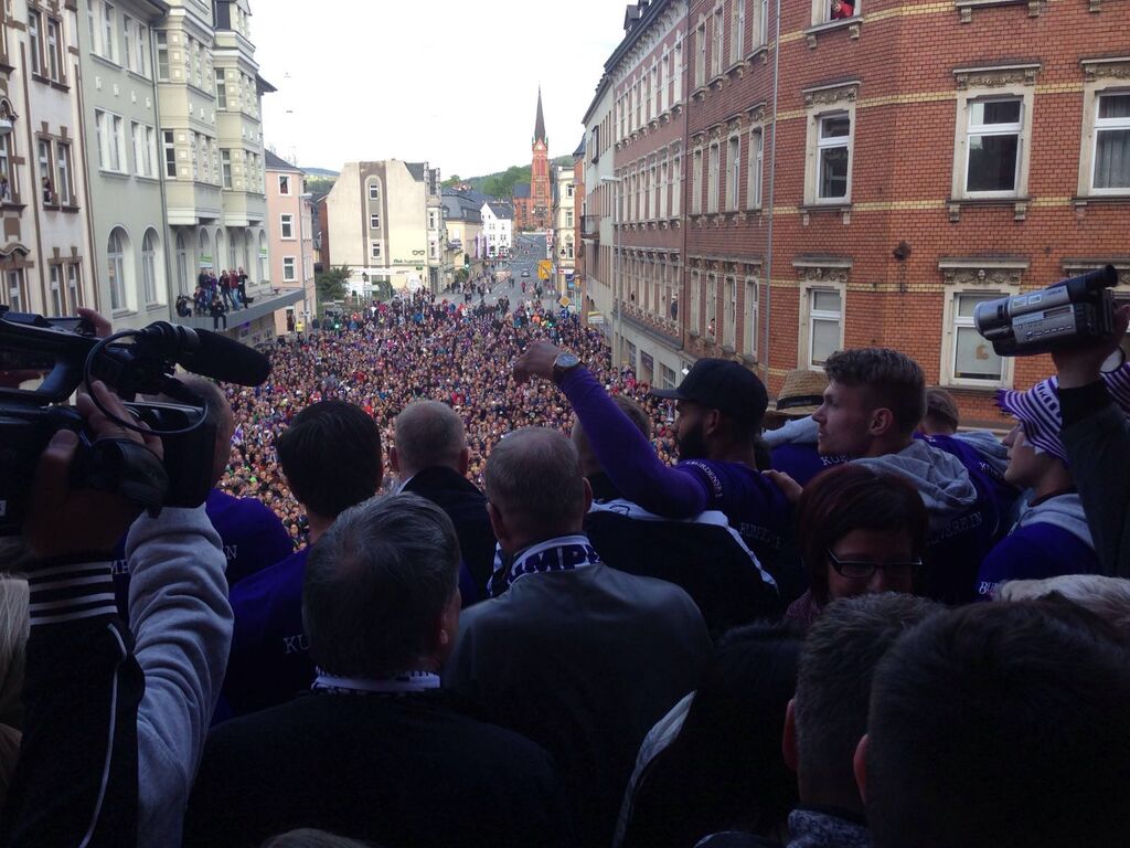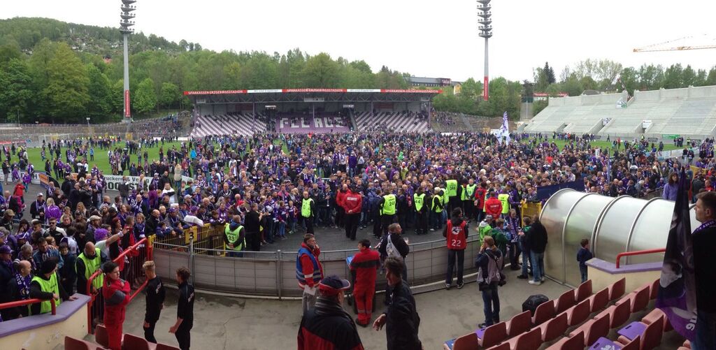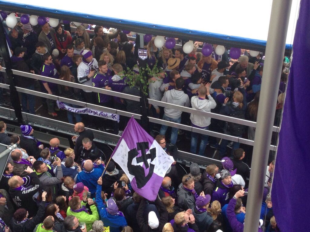 Der FC Erzgebirge Aue hat sich mit einem Sieg aus der 3. Fußball-Liga verabschiedet. Der Aufsteiger besiegte den SC Preußen Münster vor 9000 Zuschauern mit 3:0 (2:0). Für Aue trafen Pascal Köpke (15., 83.) und Simon Skarlatidis (41.). Für beide Mannschaften war die Partie von geringem sportlichen Wert, da der Aufstieg des FCE bereits seit einer Woche feststand und die Münsteraner im Mittelfeld der Tabelle stehen. . Aue-Trainer Pavel Dotchev schickte den 19-jährigen Robert Jendrusch ins Tor und brachte Ersatzmann Louis Samson von Beginn an. Auch der SCP hatte in der ersten Elf ordentlich rotiert. Die Partie startete munter, mit zahlreichen Chancen auf beiden Seiten. Mit einem wuchtigen Schuss aus kürzester Distanz brachte Leih-Spieler Köpke die Sachsen in Führung, Skarlatidis sorgte mit einem direkt verwandelten Freistoß für klare Verhältnisse. In der zweiten Halbzeit plätscherte das Spiel dem Abpfiff entgegen, ehe Köpke in der Schlussphase mit einem sehenswerten Hacken-Treffer erhöhte. Ein Platzsturm der Auer Fans beendete die Partie vorzeitig.(dpa)Nach dem Spiel setzt sich der Tross mit den FCE-Kickern gegen 17:30 Uhr in Bewegung. Ziel ist das Rathaus, wo sich die Zweitligaaufsteiger auf dem Balkon zeigen werden, Tausende Fans werden ihnen zujubeln.Und dann kommen die Veilchen zu uns auf die Radio-Erzgebirge-Bühne vorm Kulturhaus im Stadtgarten, dort geht die Party weiter – mit André Hardt von André und die Morgenmädels.