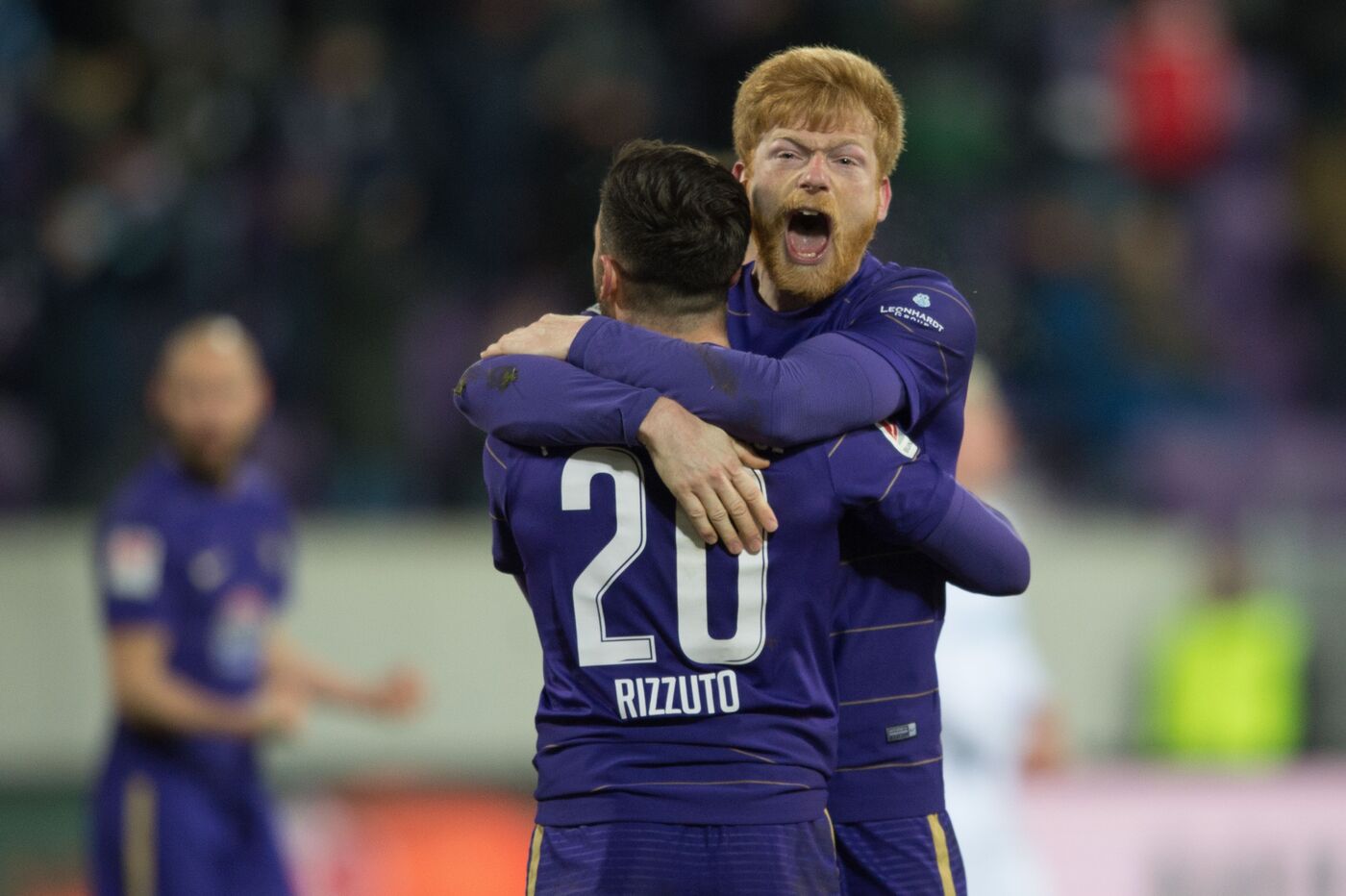 - Aues Fabian Kalig (r) jubelt nach dem Spiel mit Aues Calogero Rizzuto Foto: (c) Sebastian Kahnert/dpa