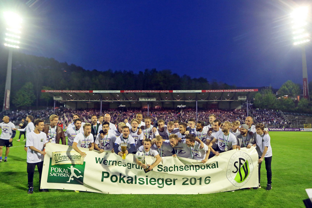 Der FC Erzgebirge Aue hat den Sachsenpokal gewonnen. Im Finale feierten die Veilchen am Dienstagabend einen 1:0-Erfolg gegen den Regionalligisten FSV Zwickau. Mario Kvesic sorgte vor 7.500 Zuschauern in der 60. Minute für den entscheidenden Treffer. Bereits vorab war Erzgebirge Aue für den DFB-Pokal qualifiziert. Trainer Pavel Dotchev schonte drei Tage nachdem der Aufstieg in die 2. Bundesliga perfekt gemacht wurde einige seiner Stammkräfte. Die Spieler aus der zweiten Reihe durften sich gegen Zwickau beweisen.Überschattet wurde das Endspiel von Provokationen und Pyrotechnik in beiden Fanlagern. Vor dem Anpfiff hatten Zwickauer Chaoten eine Fahne der Auer geklaut. Zudem wurde der Anpfiff durch massiven Einsatz von Pyrotechnik verzögert. In der Schlussphase versuchten einige Fans aus dem Gästeblock sogar den Platz zu stürmen, konnten von der Polizei aber gestoppt werden. Auch Raketen und Bengalos flogen auf die gegnerische Tribüne, von wo aus sie in den Zwickauer Block zurückgeworfen wurden.