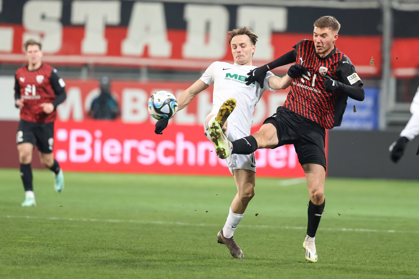 Die erste Halbzeit verlief weitestgehend ohne Chancen. Erst nach einem Fehlpass von Marco Schikora an der Mittellinie starteten die Schanzer den ersten Konter, der Torschuss von Pascal Testroet prallte am Oberkörper vom Auer Niko Vukancic ab und landete zum 1:0 im Tor. Mit dem 1:0 für Ingolstadt ging es wenig später in die Pause.
