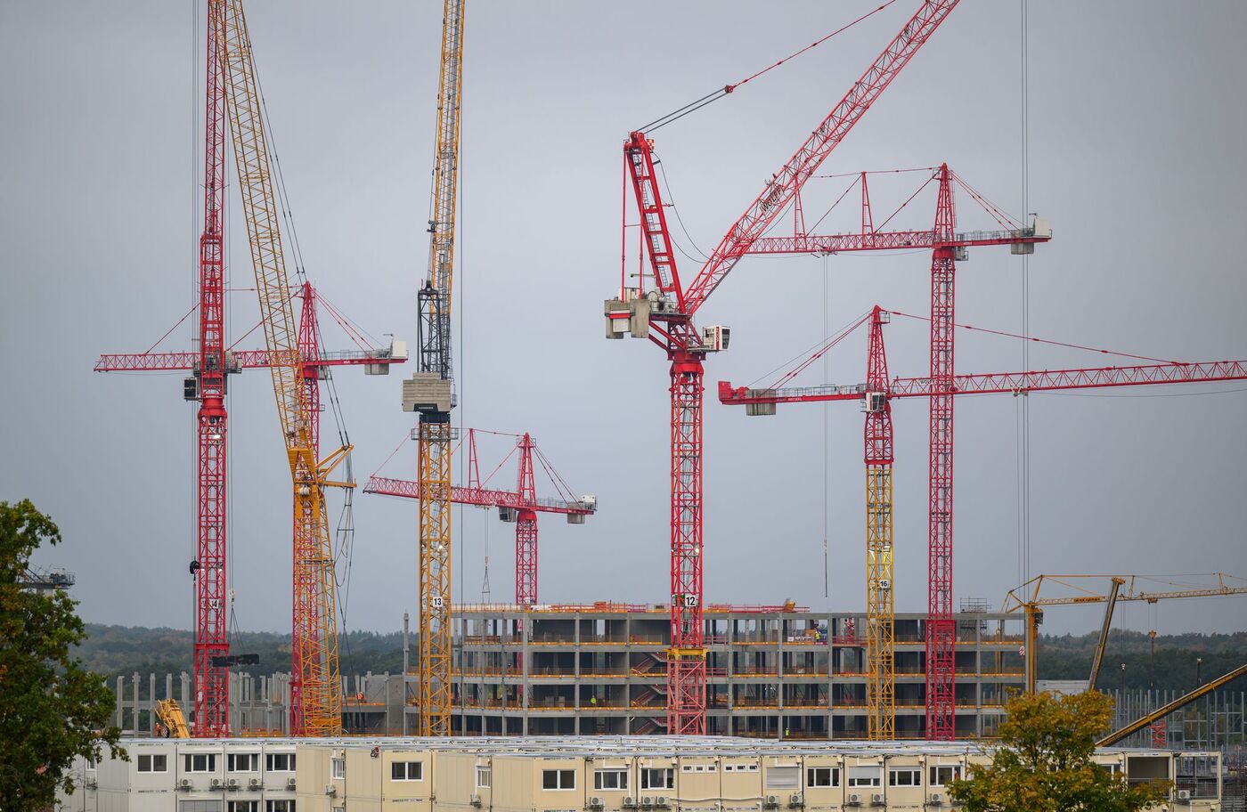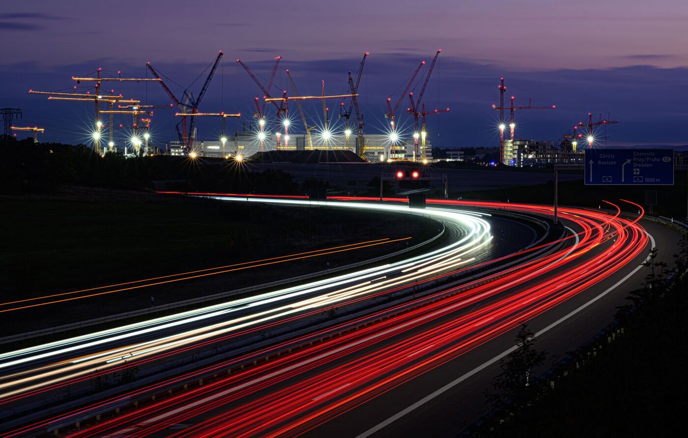 • Bis zu 30 Kräne drehen sich derzeit auf der Baustelle von ESCM in Dresden.