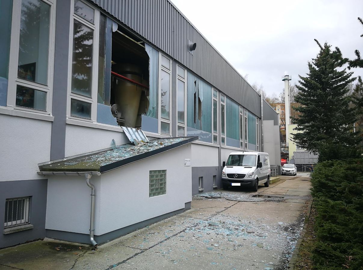 Im Gewerbegebiet Panther in Ehrenfriedersdorf mussten Feuerwehrleute wegen einer Verpuffung anrücken. Dienstagnachmittag war an der Max-Wenzel-Straße in einer Firma ein Pulvergerät explodiert. Das Feuer danach konnte schnell gelöscht werden. Teile der Glasfassade wurden massiv zerstört, die Scherben lagen vor dem Gebäude verteilt. Der Schaden wird auf mehrere zehntausend Euro geschätzt. Die Wucht der Explosion war so heftig, dass es eine Tür aus der Verankerung gerissen hat. Nach etwa zwei Stunden konnten die 20 Kameraden der Freiwilligen Feuerwehr Ehrenfriedersdorf die Einsatzstelle wieder verlassen.