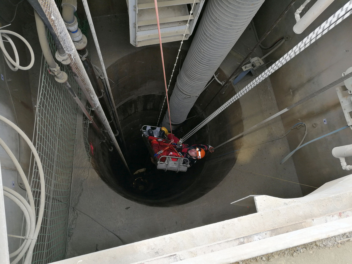 - Bei einer Grubenwehrübung Anfang Mai wurde eine fiktiv verletzte Person mit Hilfe einer speziellen Seiltechnik der Wismut aus dem Schacht geborgen. Foto: SME AG