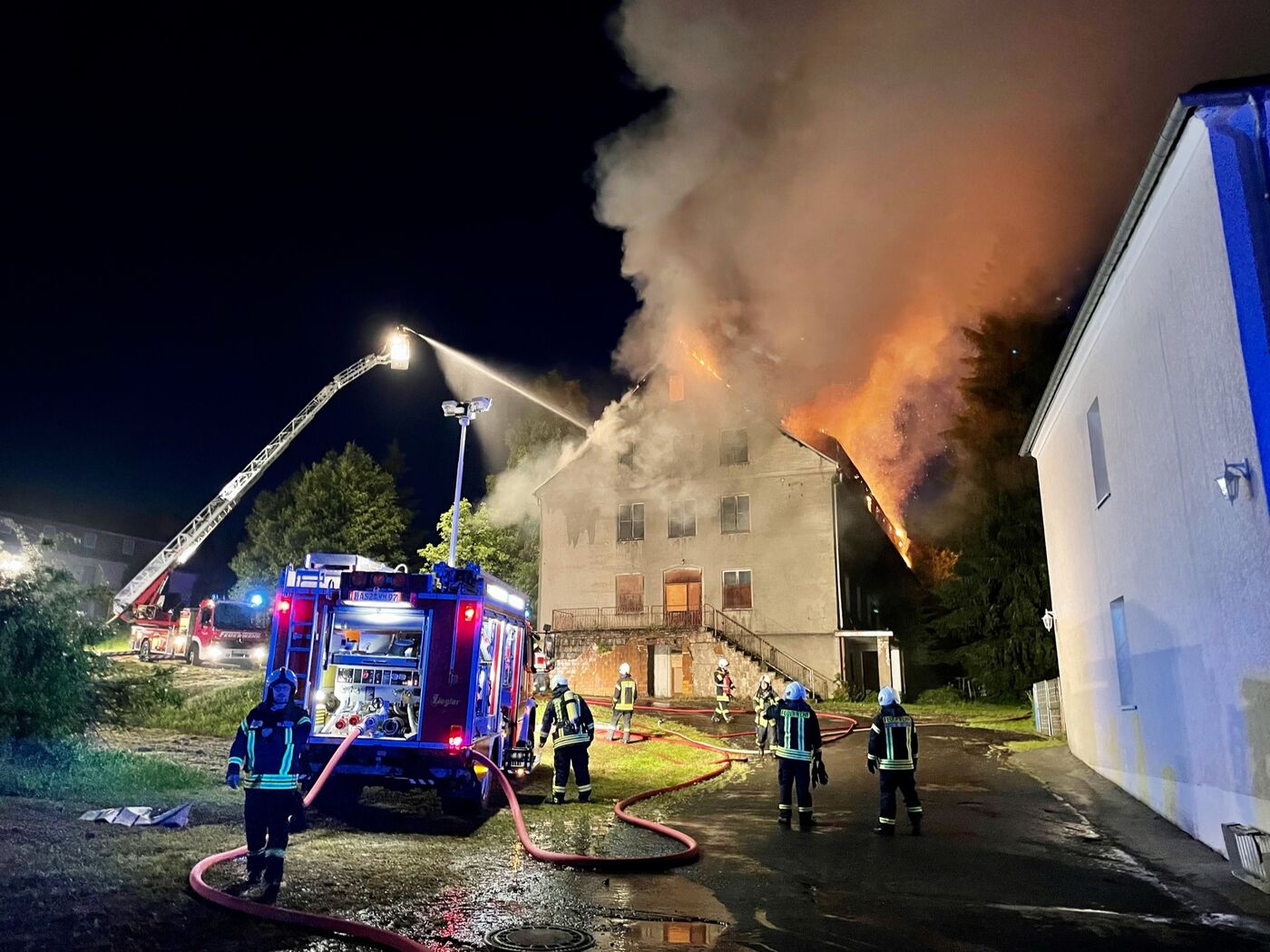 In der Nacht ist in Johanngeorgenstadt ein leerstehendes Gebäude in Flammen aufgegangen. Insgesamt 60 Kameraden der Feuerwehren Aue, Schwarzenberg, Erlabrunn, Breitenbrunn, Antonsthal und Johanngeorgenstadt bekämpften das Feuer. Mit zwei Drehleitern und mehreren Angriffstrupps versuchten sie den Brand unter Kontrolle zu bekommen. Dafür mussten auch mehrere Bäume gefällt werden, um an das Gebäude heranzukommen. Die Polizei geht derzeit von Brandstiftung aus und hat entsprechende Ermittlungen aufgenommen.
