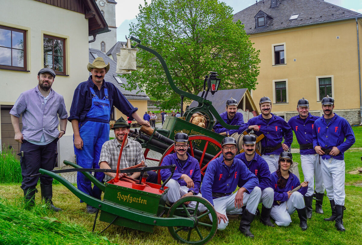 - Mit historischer Technik und in passender Kleidung geht es zum Löschangriff.