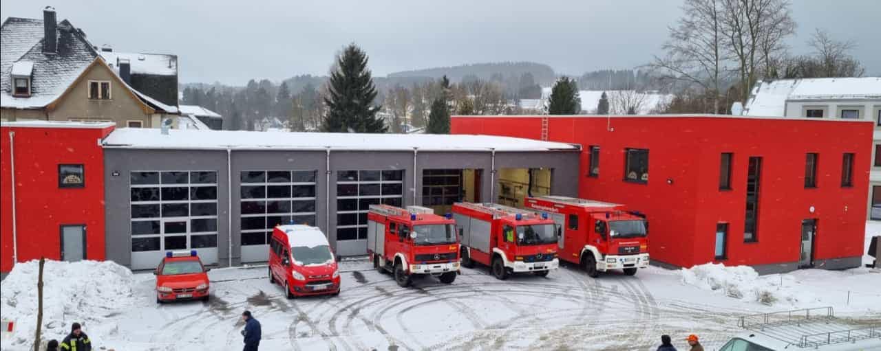 - Das neue Gerätehaus hat fünf Stellflächen für Fahrzeuge, Umkleiden, Schulungs- und Sanitärräume.