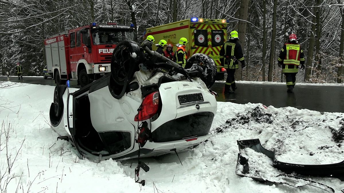 Bei einem Unfall zwischen Steinbach und Satzung ist ein Mensch verletzt worden. Aufgrund von Glätte waren am Mittwochnachmittag ein Opel und ein Audi zusammengestoßen. Der Opel überschlug sich und blieb auf dem Dach liegen. Der Audi kam an einem Baum im Straßengraben zum Stehen. Die Feuerwehr Steinbach war im Einsatz und sicherte die Unfallstelle ab.