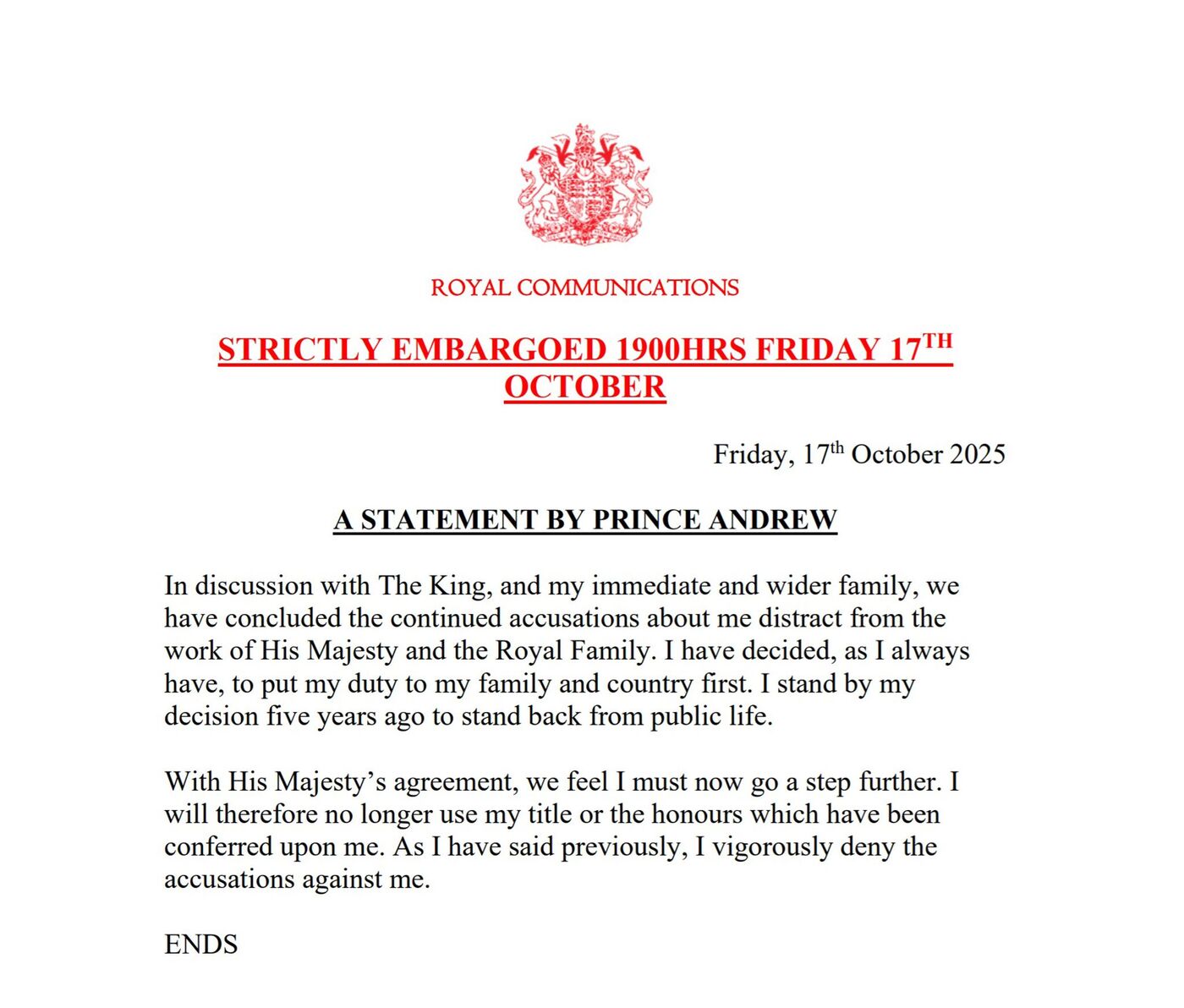 - Die Erklärung zum Ende von Andrew als Herzog von York.