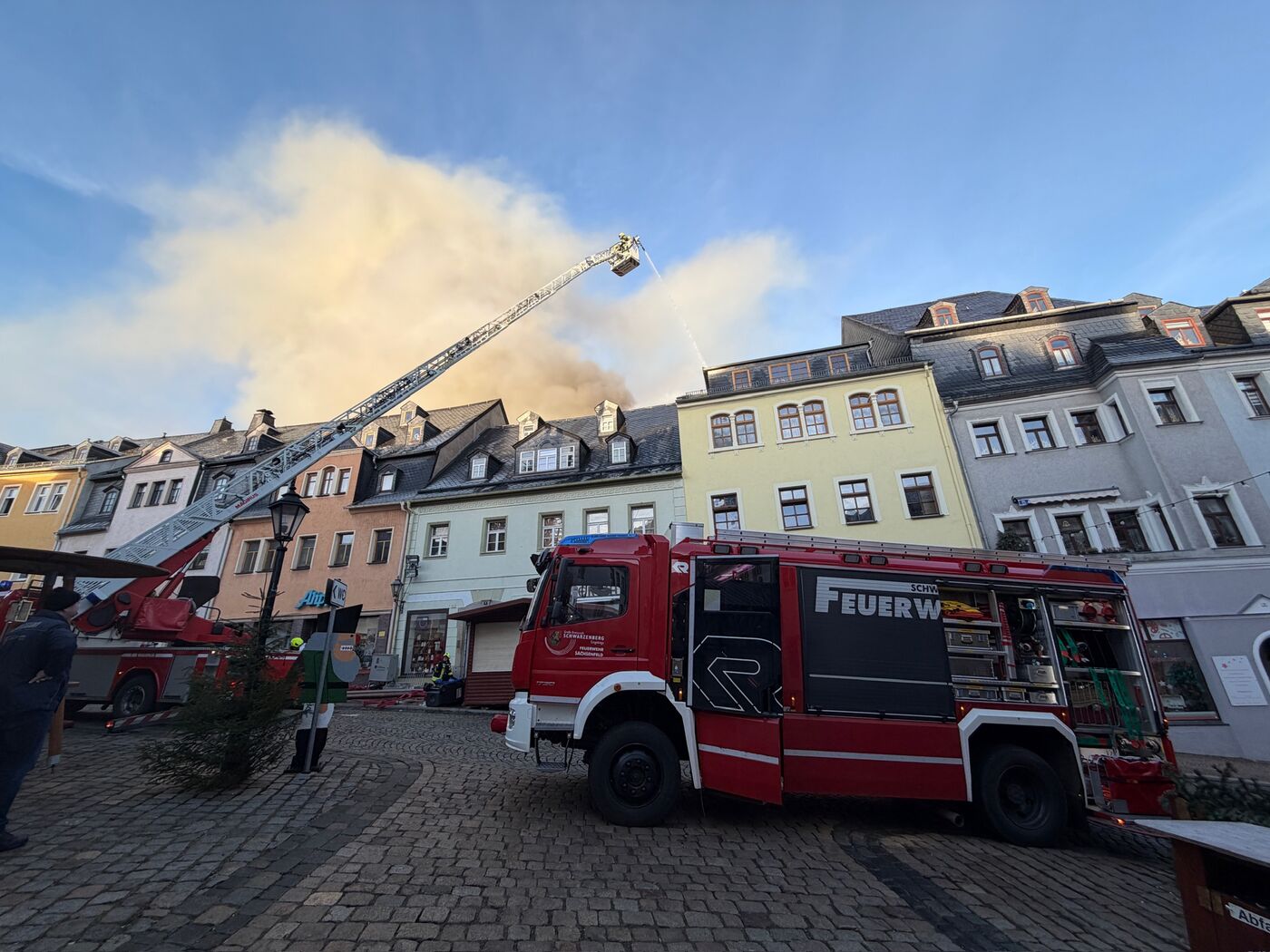 Für die Löscharbeiten sind unter anderem zwei Drehleitern aus Schwarzenberg und Aue im Einsatz. Außerdem auch die Einsatzfahrzeuge der umliegenden Feuerwehren. Zwei Kreisbrandmeister sind vor Ort. Auf dem Markt stehen noch die Buden des Weihnachtsmarktes. Diese behindern die Löscharbeiten aber nicht, so ein Reporter vor Ort.