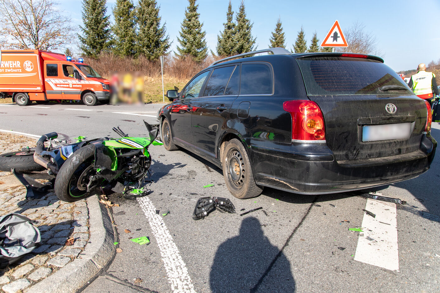 Auf der S258 bei Zwönitz hat es am Samstagmittag einen schweren Verkehrsunfall gegeben. Gegen 12:45 Uhr wollte eine Toyota-Fahrerin von der Straße in Richtung Stollberg auf die S257 abbiegen und übersah dabei offenbar einen entgegenkommenden Motorradfahrer. Beide Fahrzeuge stießen frontal zusammen, der Biker wurde schwer verletzt und per Rettungshubschrauber in eine Klinik gebracht. Laut einem Reporter vor Ort erlitten die Autofahrerin und zwei Kinder im Wagen einen Schock. Feuerwehr, Rettungsdienst und Polizei waren mit zahlreichen Kräften vor Ort, die S258 wurde zeitweise voll gesperrt. Zur genauen Unfallursache wird jetzt ermittelt.