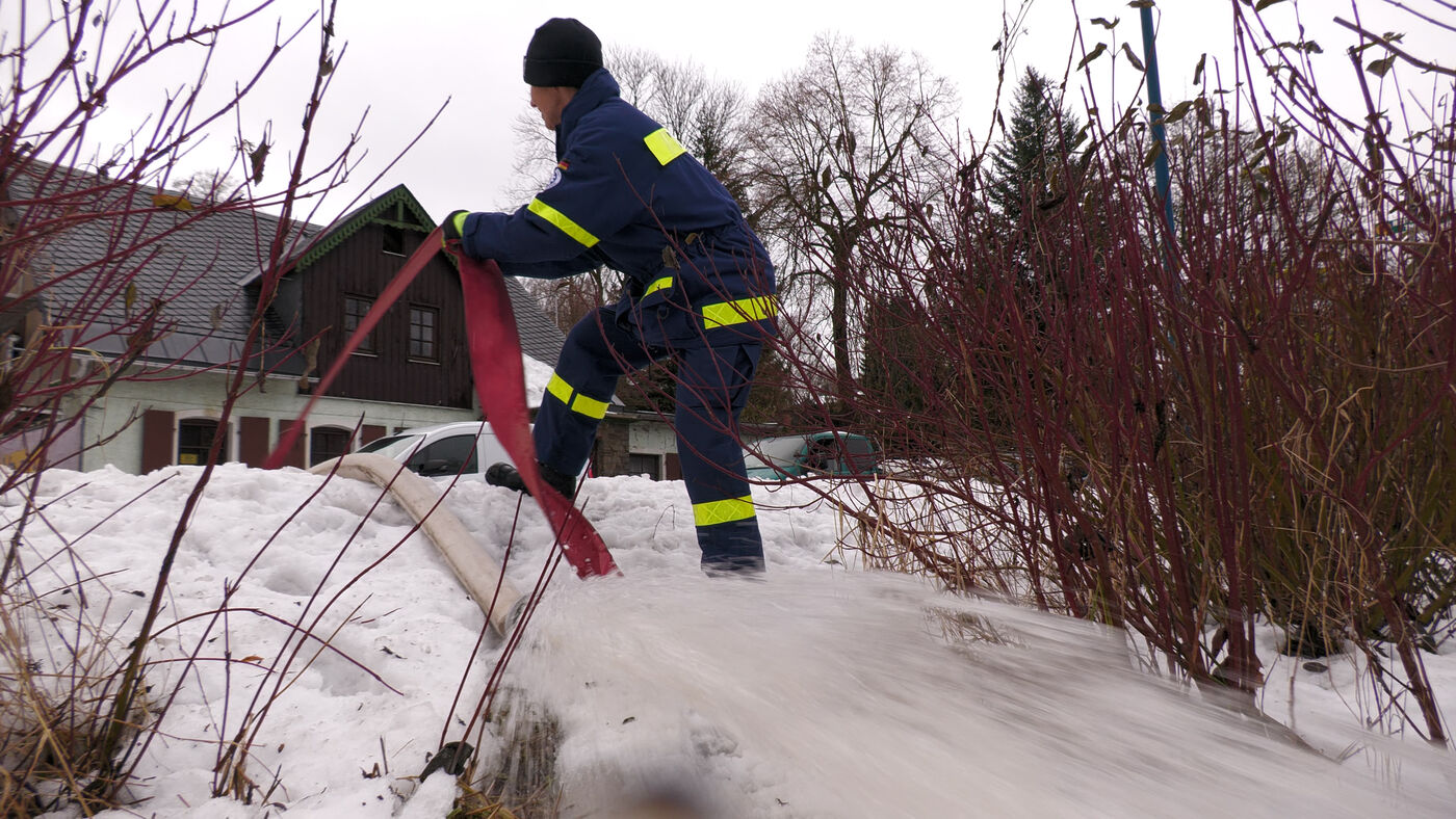 Im Erzgebirge sind die Kameraden von Feuerwehr und Technischem Hilfswerk seit Samstag im Dauereinsatz. Nach den extremen Schneefällen taut es jetzt kräftig. Flüsse und Bäche treten über die Ufer. In Tannenberg führt die Zschopau am Sonntag massives Hochwasser. Mit Sandsäcken versuchen die Einwohner, ihre Grundstücke zu schützen.