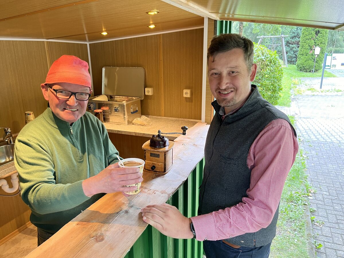 - "Kaffeekurt" Steffen Konkol und der Bürgermeister von Großrückerswalde André Rösch bei einem ersten Kaffee.
