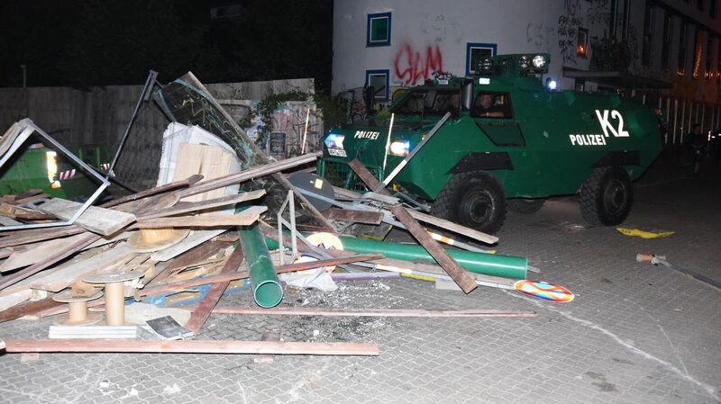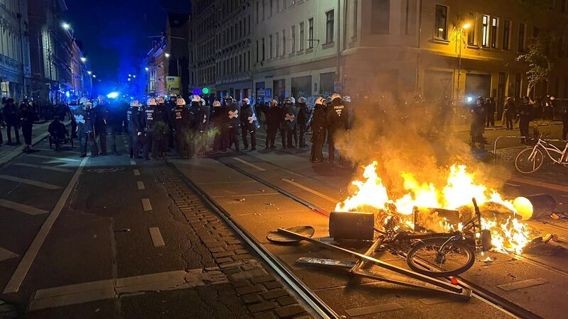 In Connewitz brennen mindestens zwei Barrikaden aus Mülltonnen und Paletten. Daneben gab es in der Wolfgang-Heinze-Straße auch Pyrotechnik und Böller, berichten dpa-Reporter. Vermummte warfen immer wieder neues Holz ins Feuer. Die Polizei ist mit Wasserwerfern im Einsatz.