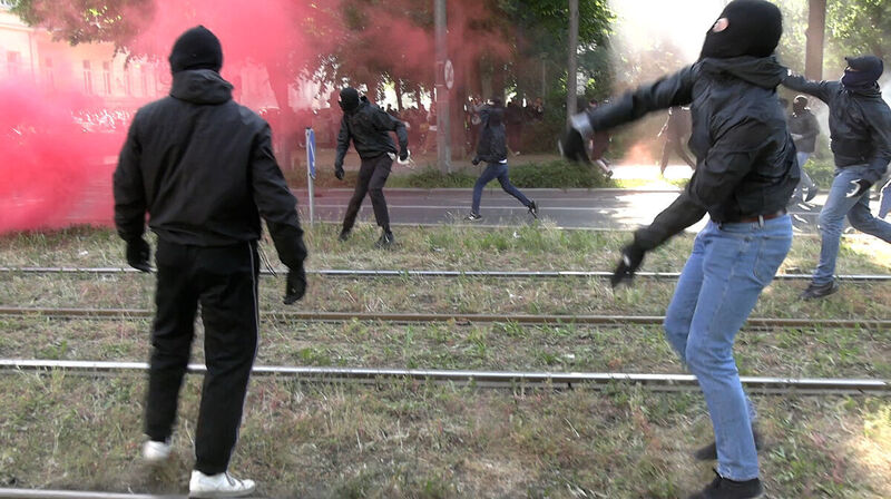 Es kommt zu Krawallen. Erste Böller fliegen aus einer schwarzen Menge in Höhe der Scharnhorststraße. Auch Straßenschilder, Flaschen und Steine werden in Richtung der Polizisten geworfen, Bengalos gezündet. Mehrere Teilnehmer bewegen sich in Richtung der HTWK. Die Polizei kesselt die Demo ein.