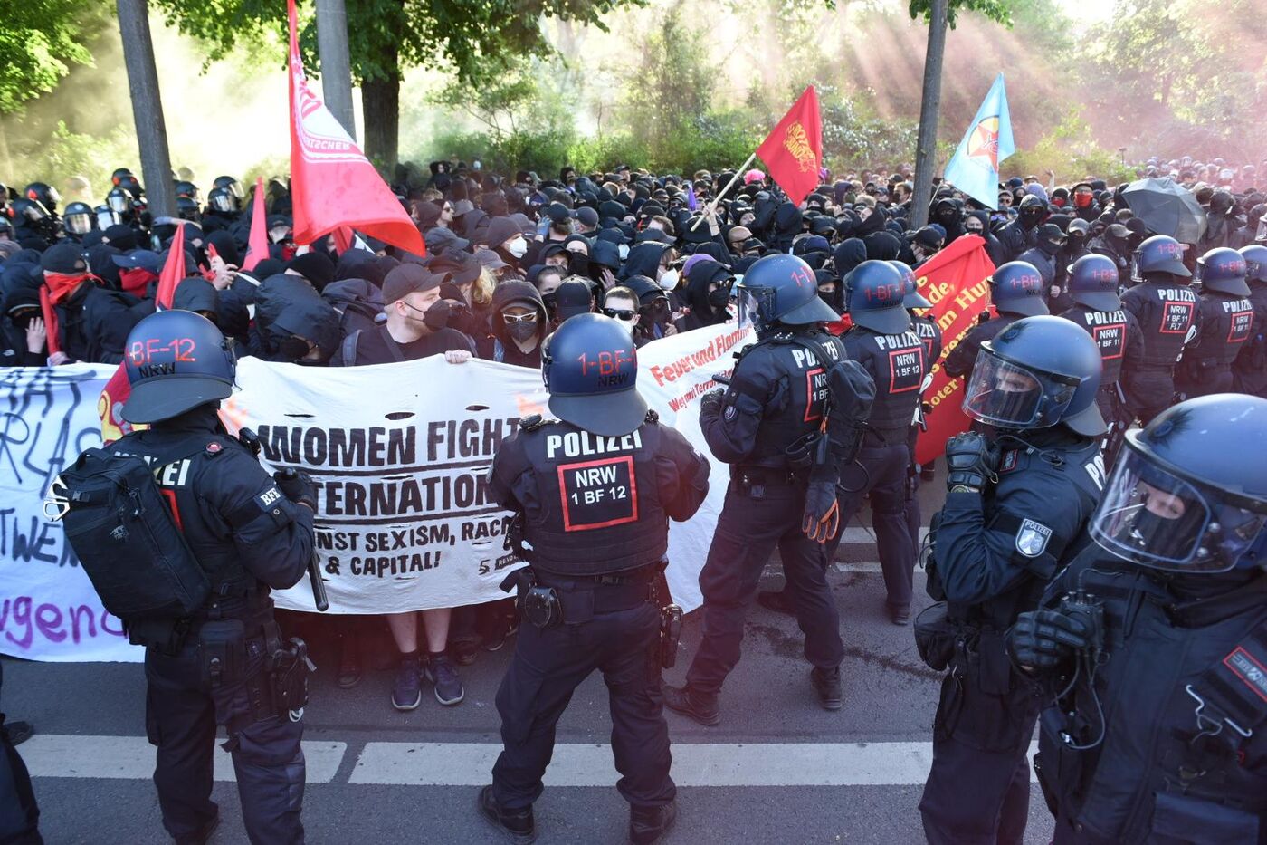 Die Lage wird unübersichtlicher. Einige hundert Menschen aus einem schwarzen Block versuchen, die Polizeisperre zu umgehen. Polizisten folgen ihnen.