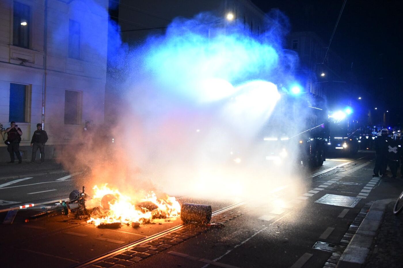 In Connewitz brennen mindestens zwei Barrikaden aus Mülltonnen und Paletten. Daneben gab es in der Wolfgang-Heinze-Straße auch Pyrotechnik und Böller, berichten dpa-Reporter. Vermummte warfen immer wieder neues Holz ins Feuer. Die Polizei ist mit Wasserwerfern im Einsatz.