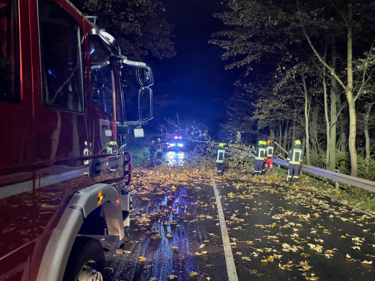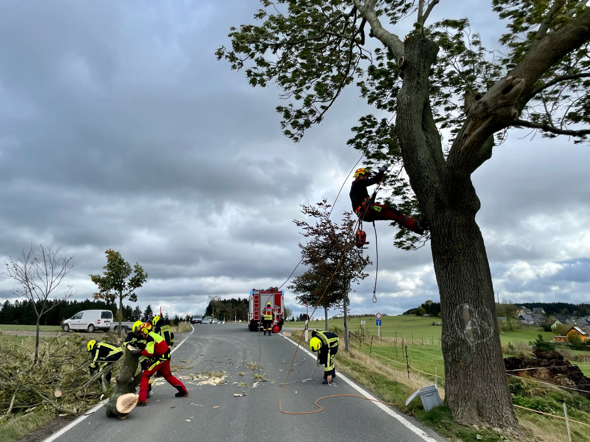 Zwischen Hartenstein und Bad Schlema konnte nicht mehr rechtzeitig bremsen und krachte in einer Baum, der die Straße blockierte. Der Fahrer blieb unverletzt, das Auto musste abgeschleppt werden. An der S 222 zwischen Bernsbach und Grünhain musste die Feuerwehr einen großen Ast aus der Baumkrone entfernen, der auf die Straße zu fallen drohte. Ein gefährlicher Einsatz, spezielle Baumsteiger kletterten bei Orkanböen in den Baum. Die Straße war für etwa eine Stunde gesperrt.