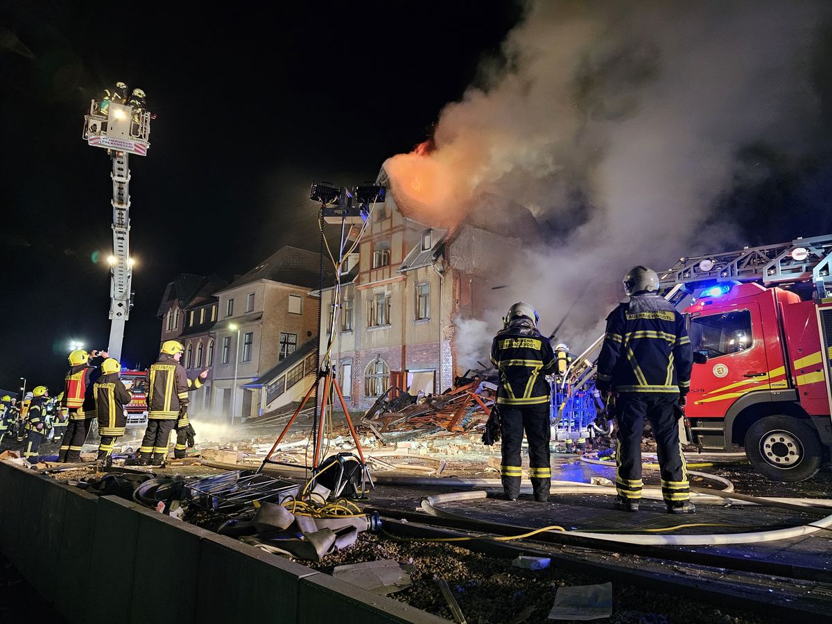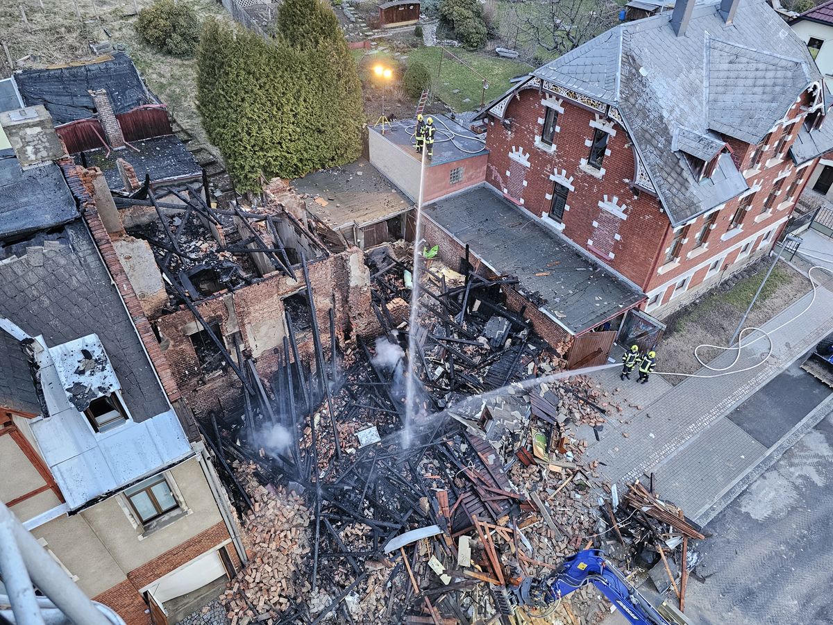 Nach einer Explosion im Keller ist in der Nacht zum Sonntag ein Mehrfamilienhaus in Ellefeld durch Feuer zerstört und ein weiteres unbewohnbar geworden. Unter den Trümmern wurde am Vormittag ein lebloser Mann gefunden. Es handelt sich laut Polizeidirektion Zwickau vom Sonntagnachmittag um den 67-jährigen Eigentümer des Hauses, von dem das Feuer ausging. Bei dem anderen Gebäude brannte der Dachstuhl aus. Nach Angaben der Behörde wird der entstandene Sachschaden auf „mindestens 600.000 Euro“ geschätzt.