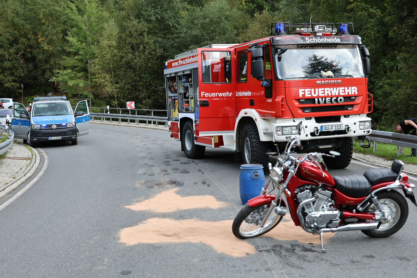 Ein Motorradausflug auf der B283 in Schönheide endete am Sonntagnachmittag für einen Motorradfahrer im Krankenhaus. Der Biker stürzte auf der Muldenstraße in einer Rechtskurve und verletzte sich schwer. Ein Rettungshubschrauber brachte den Mann ins Krankenhaus. Die Feuerwehr sicherte die Unfallstelle ab und nahm ausgelaufene Betriebsmittel auf. Die Bundesstraße war für rund zwei Stunden voll gesperrt. Die Polizei ermittelt zur genauen Unfallursache.