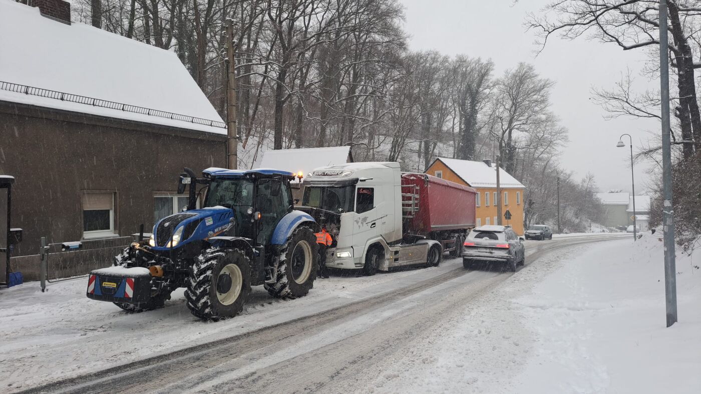 Oberbürgermeister zieht Brummis mit Traktor aus dem Schlamassel