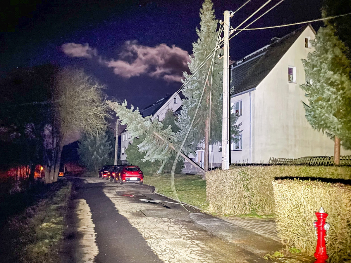 SAMSTAG, 4:30 Uhr: Das Sturmtief sorgt auch nach Mitternacht für Probleme. In Lauter-Bernsbach, Straße am Brauhausberg, rissen mehrere Stromleitungen und hingen herab. Ein Baum lag auf der Stromleitung, er konnte schnell entfernt werden. „Mehrere Haushalte bleiben wohl mindestens bis zum Nachmittag ohne Strom“, berichtet ein Reporter. Die Störungsstellen der Stromversorger seien überlastet. Viele Schäden würden wohl erst bei Tageslicht sichtbar.