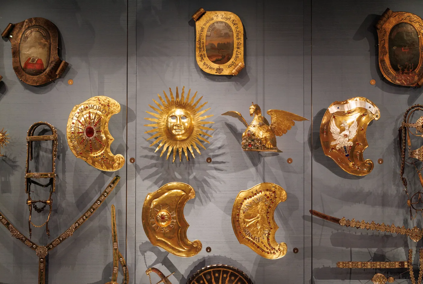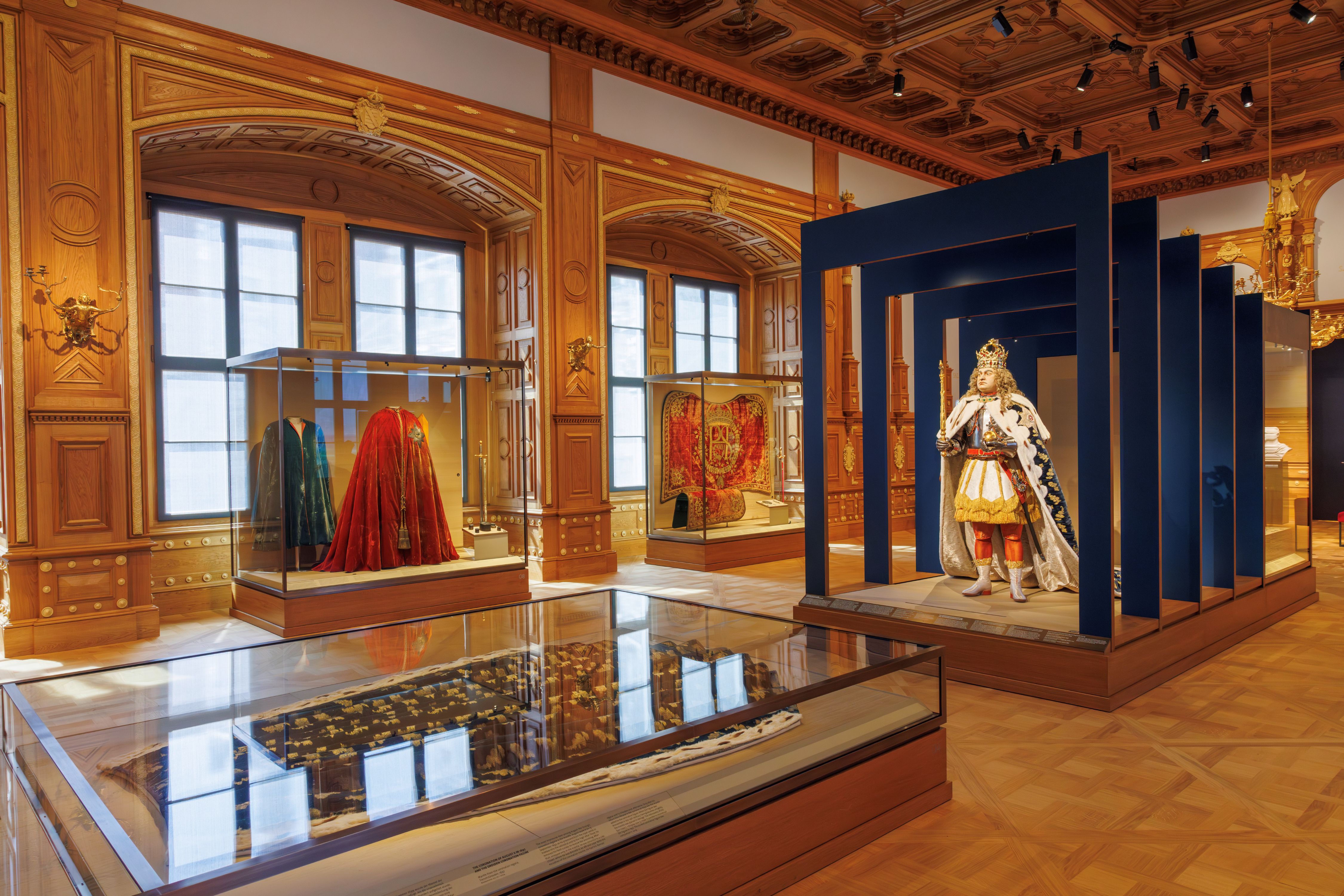 Die neue Dauerausstellung „Masken und Kronen. Festkultur und Machtrepräsentation am Dresdner Hof“ umfasst über 450 Objekte, von denen viele seit dem Zweiten Weltkrieg nicht mehr zu sehen waren. Der größte Teil stammt aus der Rüstkammer, aber auch aus dem Münzkabinett, dem Grünen Gewölbe, dem Kupferstich-Kabinett, der Galerie Neue Meister und der Skulpturensammlung. Leihgaben gewährten zudem das Sächsische Staatsarchiv und die Kunstsammlungen der Veste Coburg. Die Kunstwerke gehören zu den kostbarsten Zeugnissen europäischer Festkultur und jahrhundertealter Repräsentation fürstlicher Macht. Darunter befinden sich der einzige in Deutschland erhaltene barocke Kurhut, die Krönungsfigur Augusts des Starken und seine berühmte goldene Sonnenmaske, geschaffen von Hof-Goldschmied Johann Melchior Dinglinger.