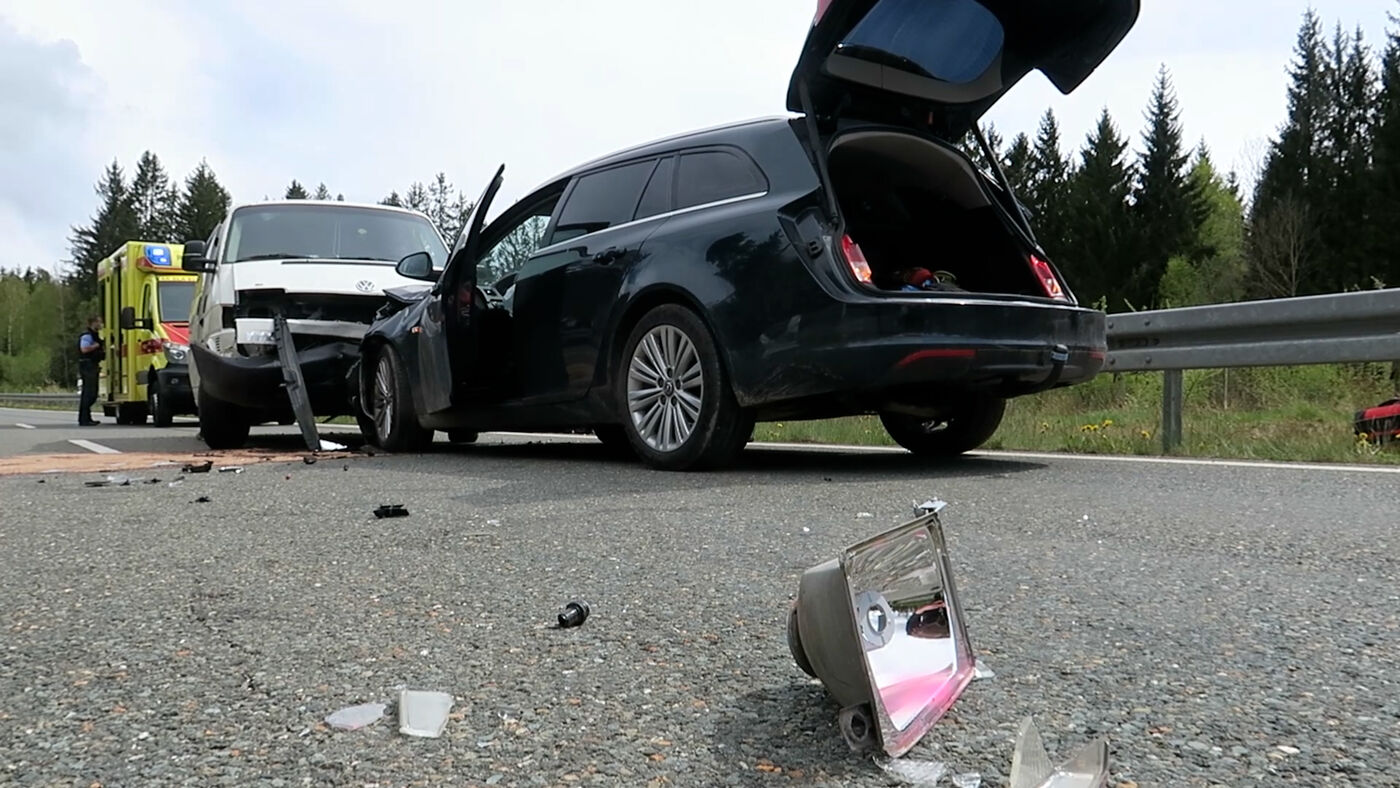 Ein VW-Transporter hatte versucht, in einer langgezogenen Rechtskurve einen LKW zu überholen. Dabei übersah der Fahrer einen entgegenkommenden PKW. Es kam zum Zusammenstoß.