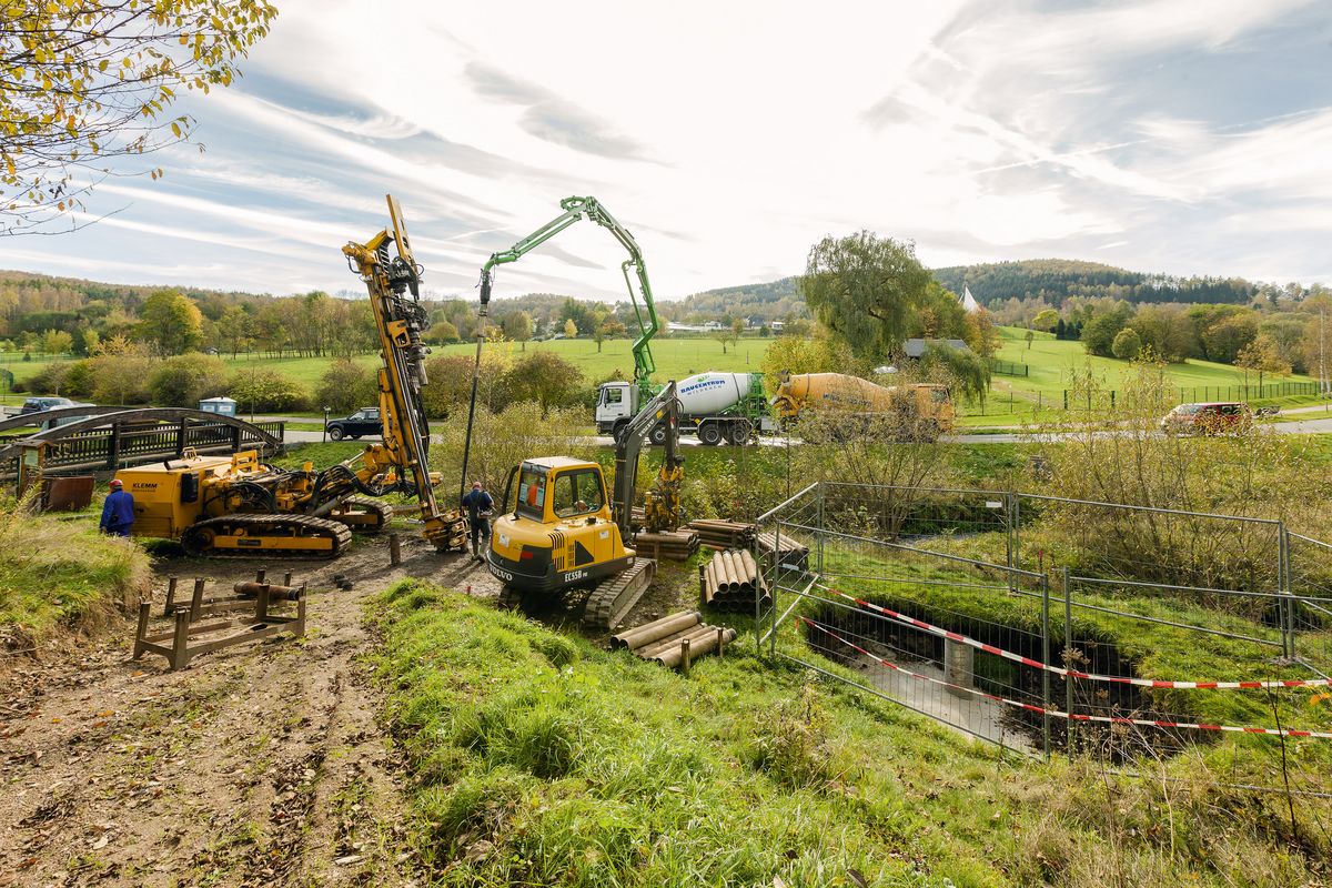 Aktuell wird an einer Tragplatte und der Schalung für den Betonpfropfen gearbeitet. Anschließend sollen der Schacht und auch ein Wetterkanal mit Beton verfüllt werden.