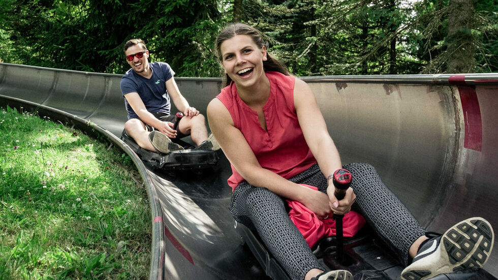 Zuerst geht’s ganz entspannt 400 Meter nach oben. Oben angekommen, genießt ihr einen herrlichen Blick auf die herbstliche Landschaft, bevor ihr auf einer Strecke von etwa 1.000 Metern rasant bergab saust. Der Fahrtwind weht euch dabei um die Nase und sorgt für einen echten Adrenalinkick!