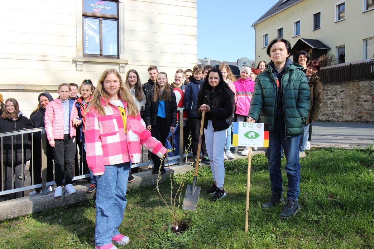Ukrainische und deutsche Schüler haben am Gymnasium Olbernhau am Freitagvormittag gemeinsam einen Baum gepflanzt. Hintergrund ist das internationale Projekt „Climate Action“. Dabei werden Ziele für den Klimaschutz umgesetzt. Dieses Jahr sind es Sofortmaßnahmen zum Klimaschutz und deshalb hat man einen Baum gepflanzt.
