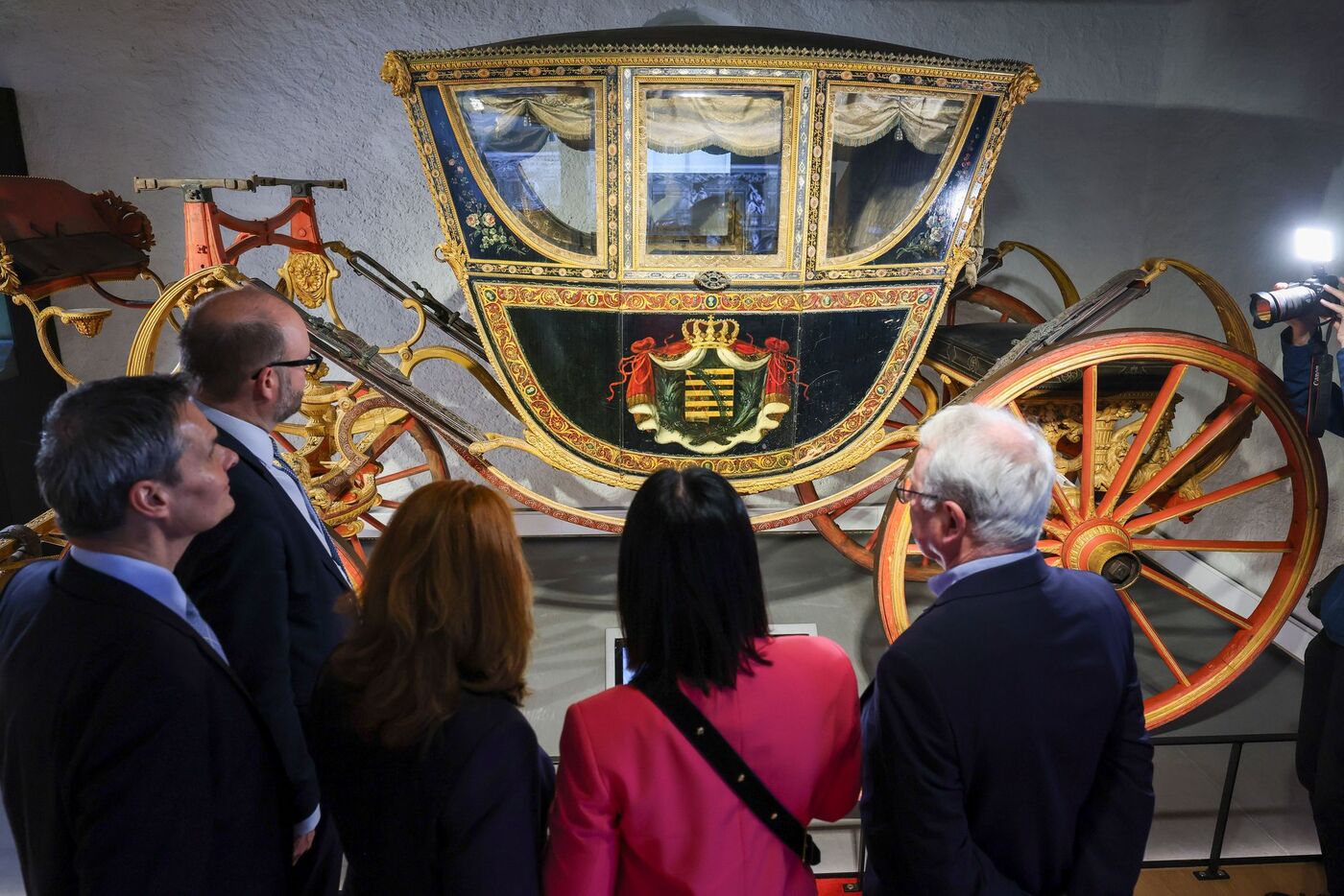 - Finanzminister Christian Piwarz (2.v.l.) besichtigt den sächsischen Gesandschaftswagen zur Kaiserkrönung am 9. Oktober 1790 im neu konzipierten Kutschenmuseum auf Schloss Augustusburg.