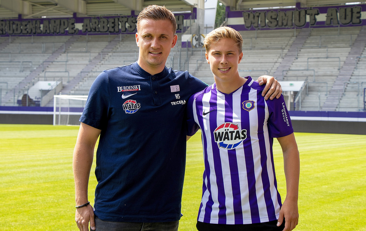 - Aue Chefcoach Aliaksey Shpileuski mit Neuzugang Sam Schreck.