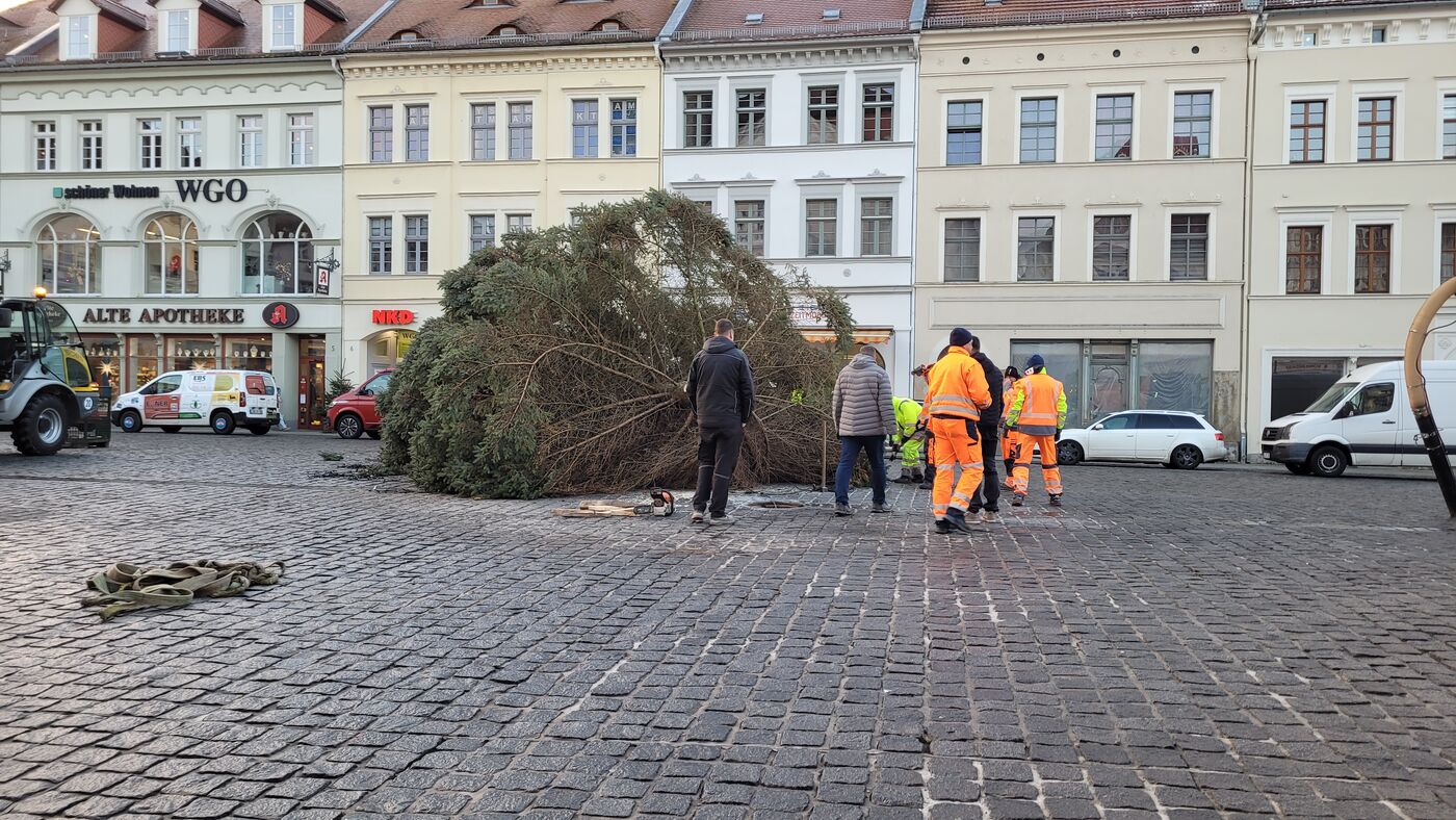- Mitarbeiter des Bauhofes haben den Schmuck abgenommen und den Stamm eingekürzt. Die Blaufichte soll wieder aufgerichtet werden.