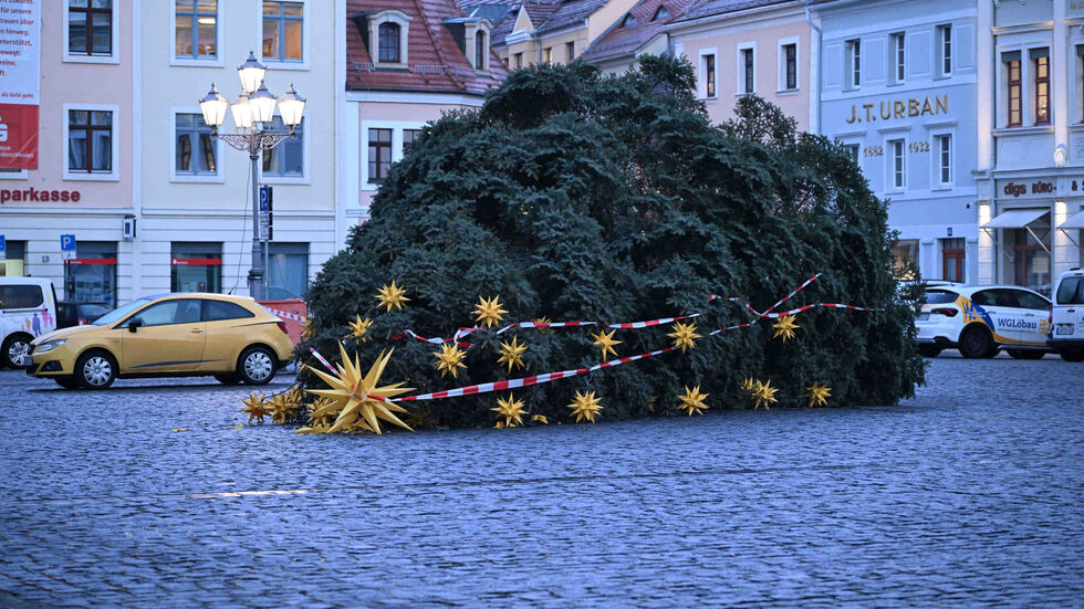 Fassungslosigkeit herrscht in Löbau. In der vergangenen Nacht wurde der Weihnachtsbaum vor dem Rathaus umgesägt. Die zehn Meter hohe Blaufichte lag am Morgen quer über dem Altmarkt. Der Schmuck wurde beschädigt, so u.a. der große Herrnhuter Stern an der Spitze. Die Lichter am Baum leuchteten noch, als nach drei Uhr die Feuerwehr eintraf.